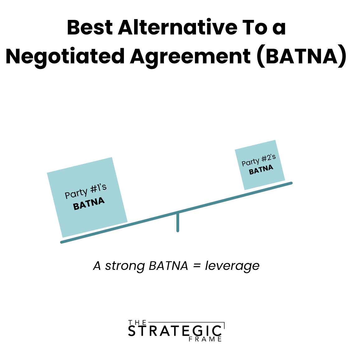 BATNA is an acronym for “Best Alternative to a Negotiated Agreement,” and it is exactly what it sounds like. It is the best option available to you if the current negotiation falls apart.