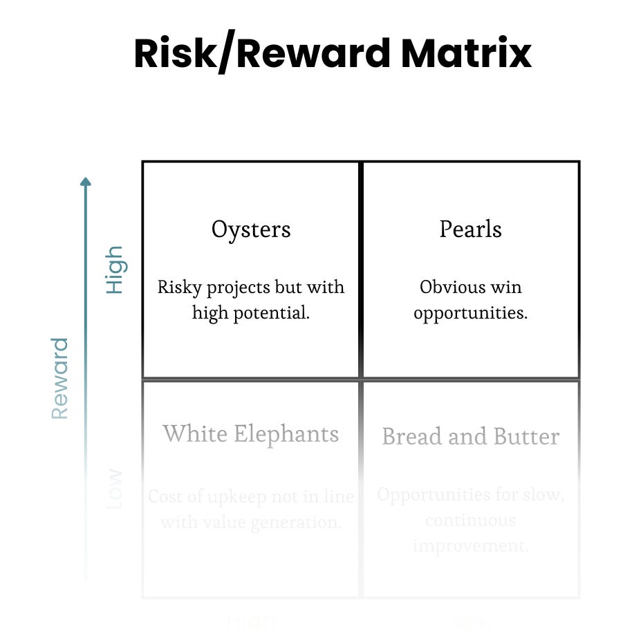 The Risk/Reward Matrix helps leaders evaluate opportunities by comparing potential payoff with the level of risk. It categorizes projects into four types: Oysters (high risk, high reward), Pearls (low risk, high reward), White Elephants (high risk, low reward), and Bread and Butter (low risk, low reward). By scoring and plotting initiatives on these two dimensions, organizations can see where to invest, scale, or divest, creating a balanced portfolio that blends innovation, growth, and stability.